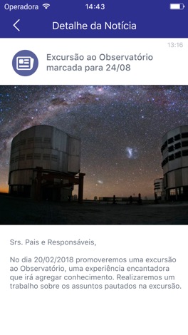 Com este aplicativo, os pais, responsáveis e professores poderão receber as últimas informações da escola, as notícias do dia a dia do seus filhos e o calendário de atividades escolares.