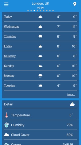 O clima é uma aplicação muito útil para todos, projetado para ser tão simples e fácil de usar. Atualize o clima local onde você mora tão rápido e facilmente. Com apenas alguns cliques você pode verificar o clima hoje: temperatura, precipitação, umidade, índice UV ...; a previsão do tempo amanhã; previsão para os próximos 3 dias; e previsão para a próxima semana.