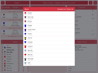 O aplicativo "inglês de Futebol De 2014-2015 - Match Centre" inclui informações completas sobre clubes de futebol - a lista de jogadores com Estatísticas.