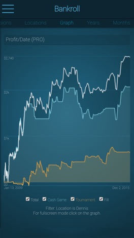 Próximo nível Poker Tracker: Grave sessões ao vivo e compartilhe com seus amigos! Com Poker Bankroll Tracker você pode salvar suas sessões de poker para ter uma visão geral sobre seu bankroll. Com muitas opções de filtros você pode encontrar as inconsistências do seu jogo e ver muitas estatísticas. Você pode também conectar com seus amigos e assistir ao vivo suas sessões. O Poker Bankroll Tracker fornece também ferramentas úteis como a calculadora para acordos ou a calculadora de prêmios.